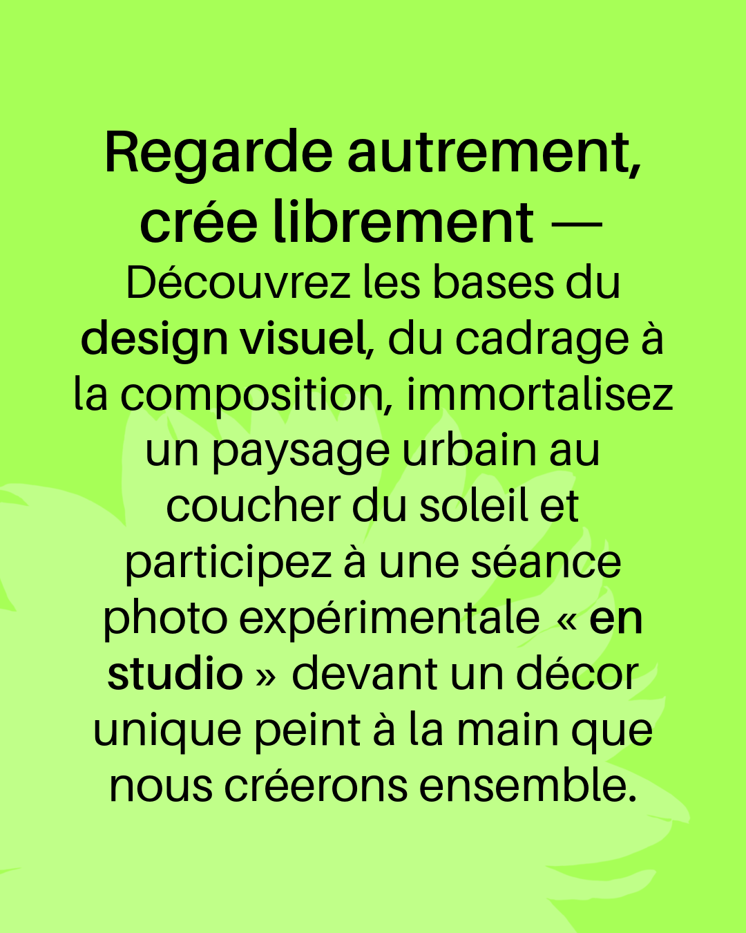 Découvrez les bases du design visuel, du cadrage à la composition, immortalisez un paysage urbain au coucher du soleil et participez à une séance photo expérimentale « en studio » devant un décor unique peint à la main que nous créerons ensemble.